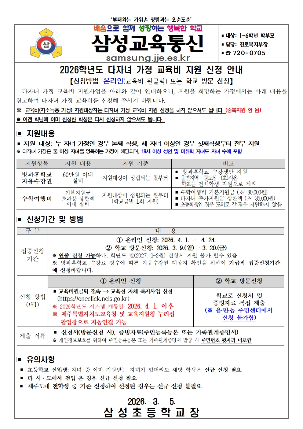 2026학년도 다자녀 가정 교육비 지원 신청 안내
