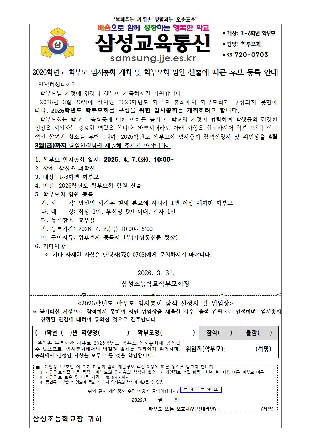 2026학년도 학부모 임시총회 개최 및 학부모회 임원 선출에 따른 후보 등록 안내