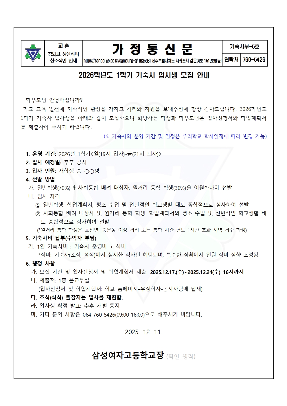 2026학년도 1학기 기숙사 입사생 모집 안내 가정통신문입니다.