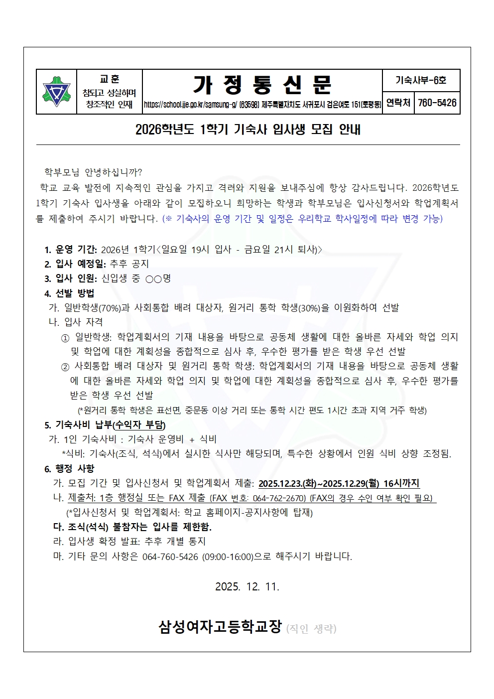 2026학년도 1학기 기숙사 입사생 모집 안내 가정통신문(신입생)
