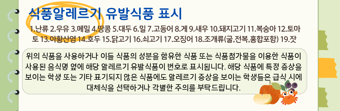 식품 알레르기가 있는 학생은 급식 시 각별히 주의 바라며, 대체식 혹은 제거식을 선택할 수 있도록 해주시기 바랍니다.