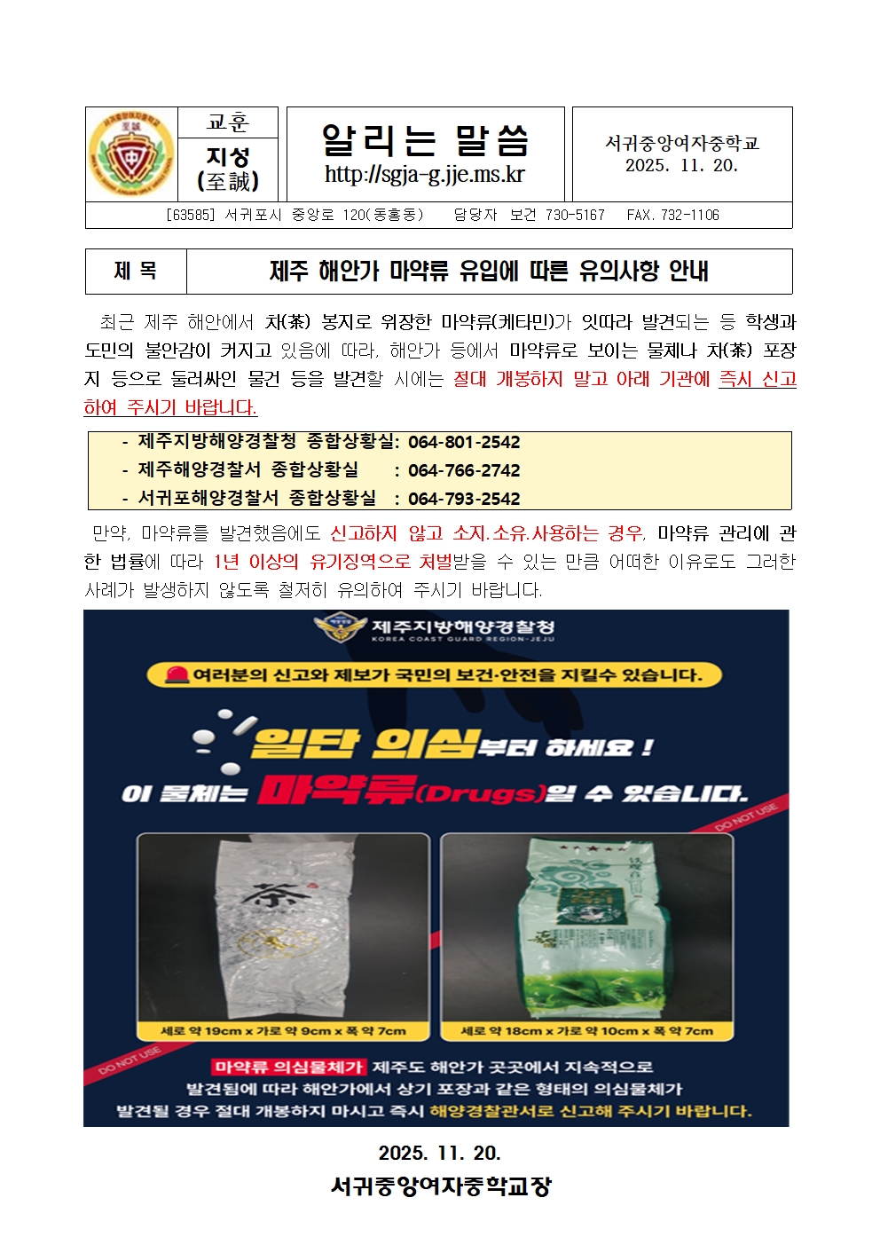 제주 해안가 마약류 유입에 따른 유의사항 안내