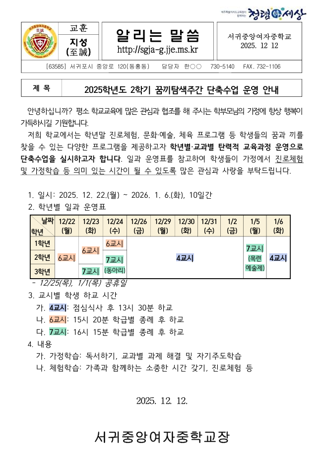 2025학년도 2학기 꿈끼탐색주간 단축수업 운영 안내