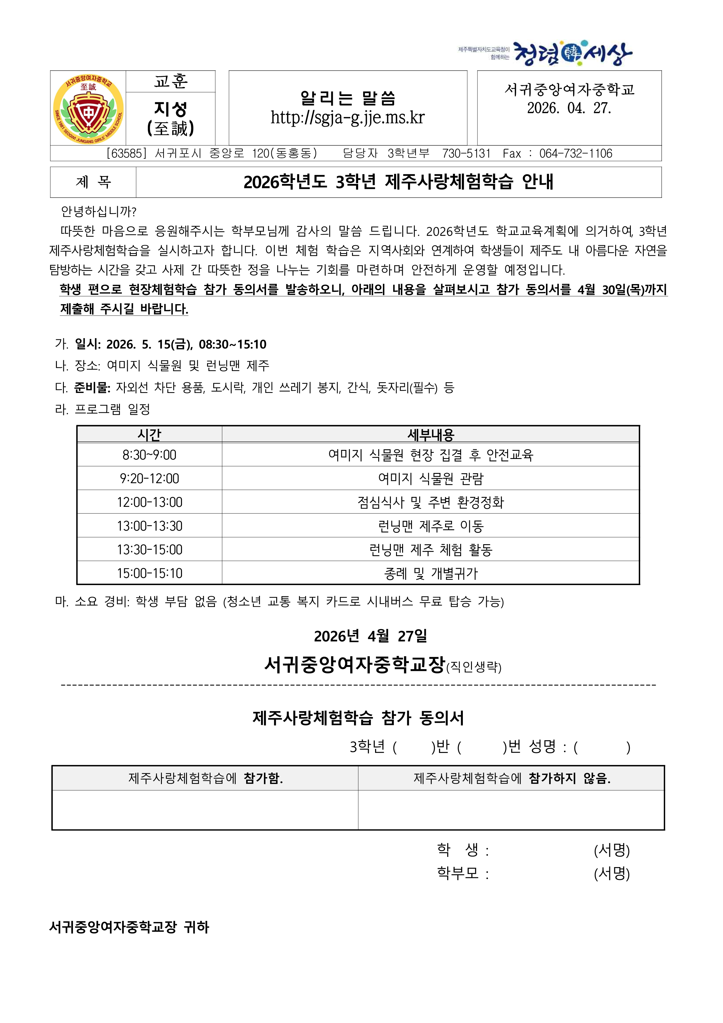 2026학년도 3학년 제주사랑체험학습 안내 가정통신문