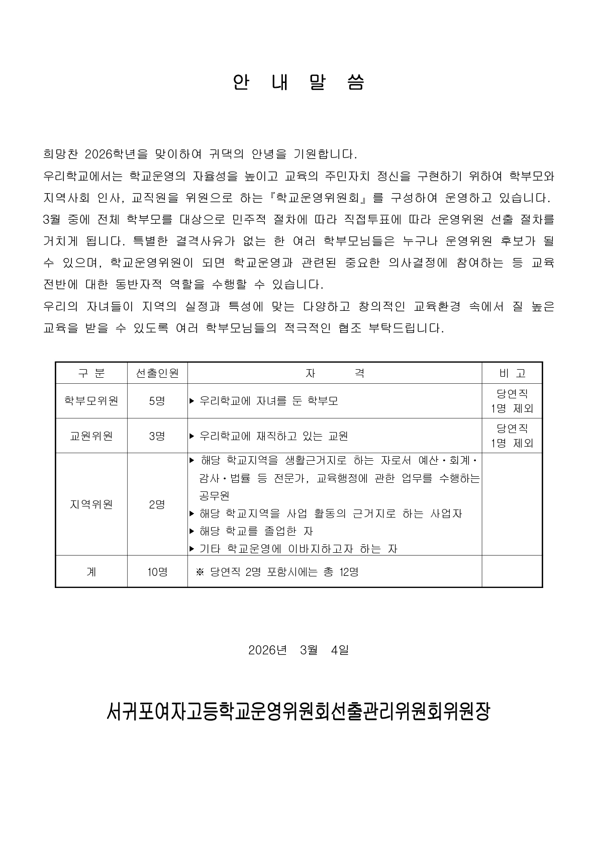 2026학년도 학교운영위원회 학부모위원 선출 공고