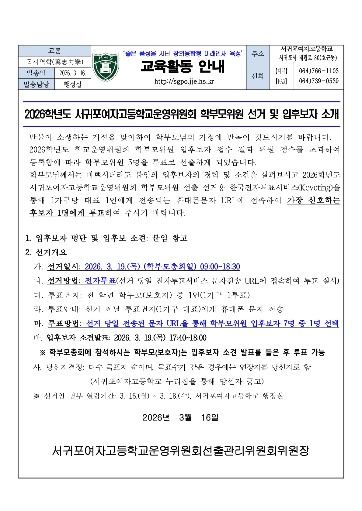 2026학년도 학교운영위원회 학부모위원 입후보자 선거공보물