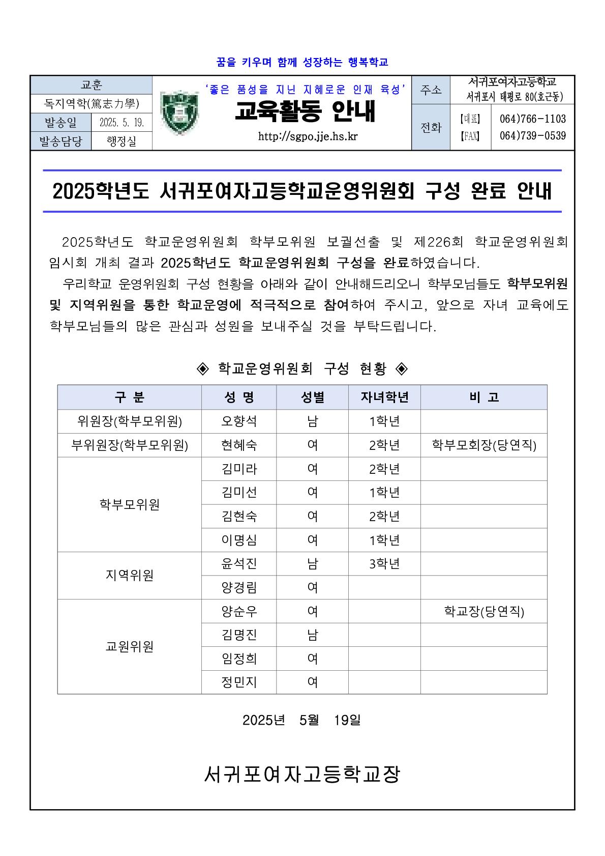 2025학년도 서귀포여자고등학교운영위원회 구성 완료 안내