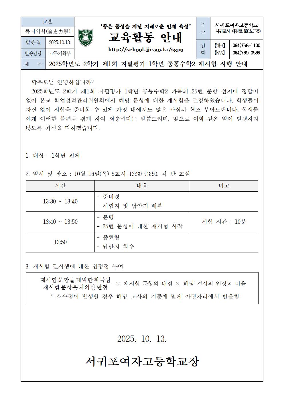 2025학년도 2학기 제1회 지필평가 1학년 공통수학2 재시험 안내