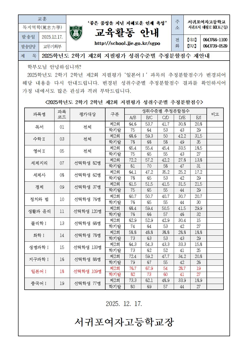 2025학년도 2학기 2학년 제2회 지필평가 및 학기말 추정분할점수 산출 결과 재안내