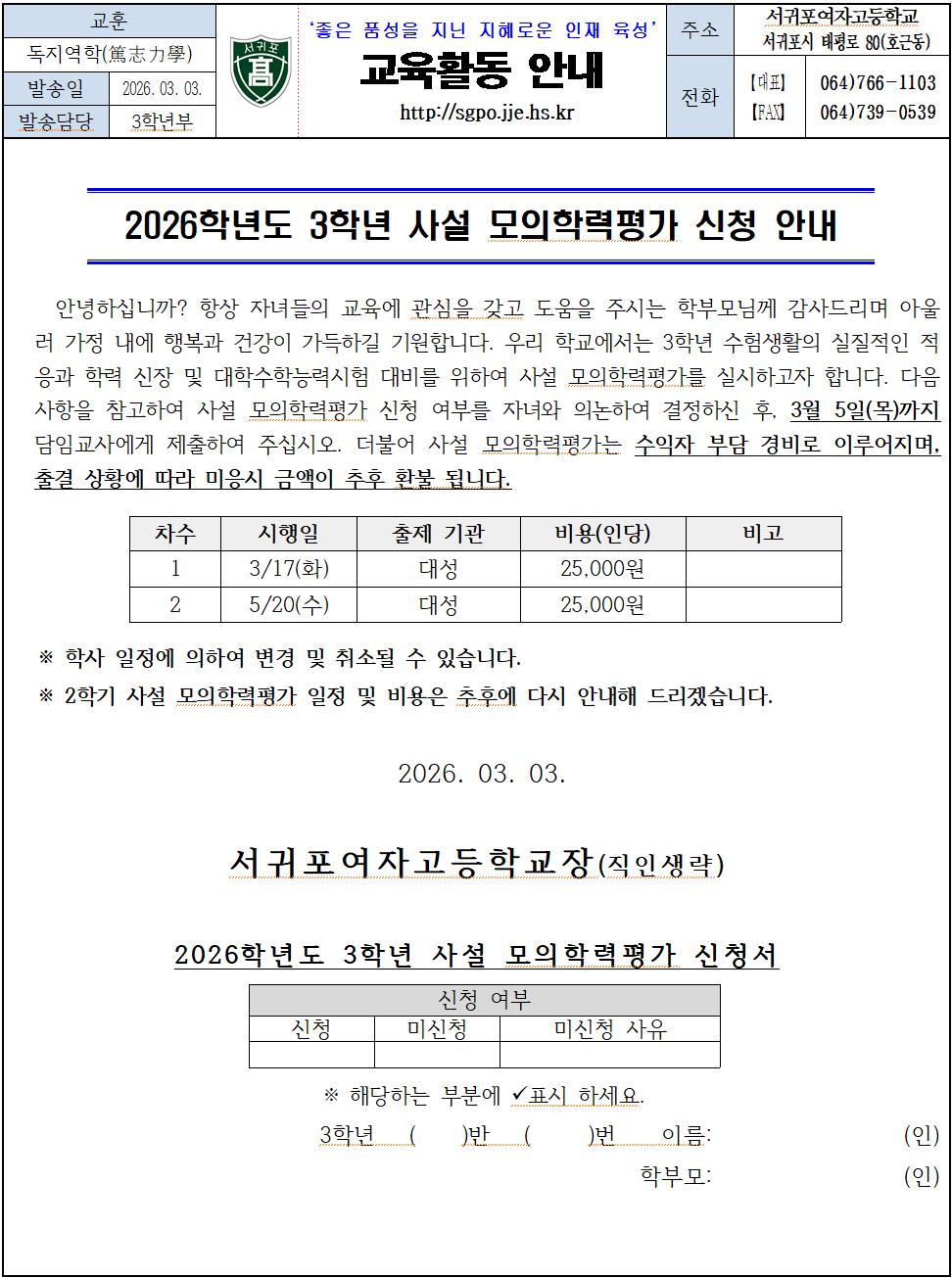 2026학년도 3학년 사설 모의고사 가정통신문