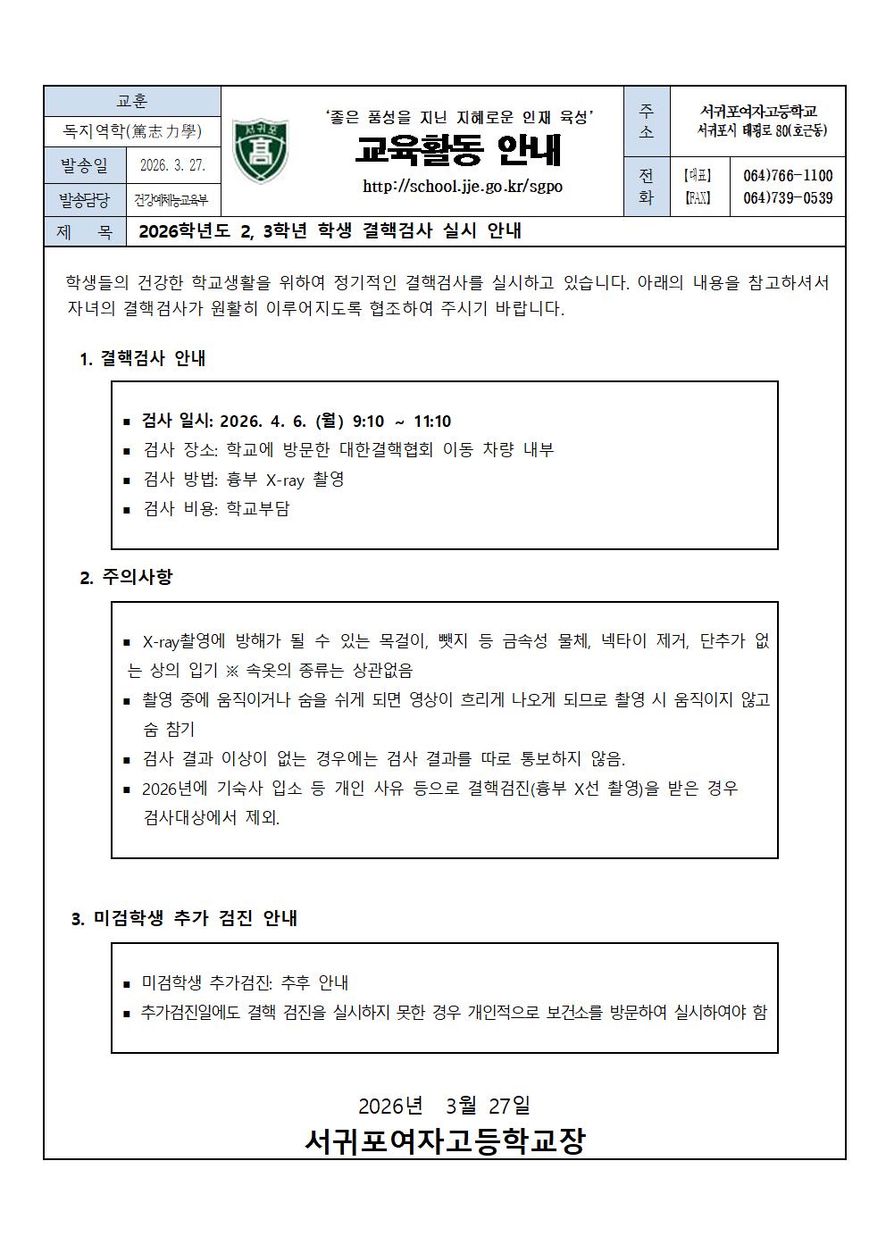 2026학년도 2, 3학년 학생 결핵검사 실시 안내