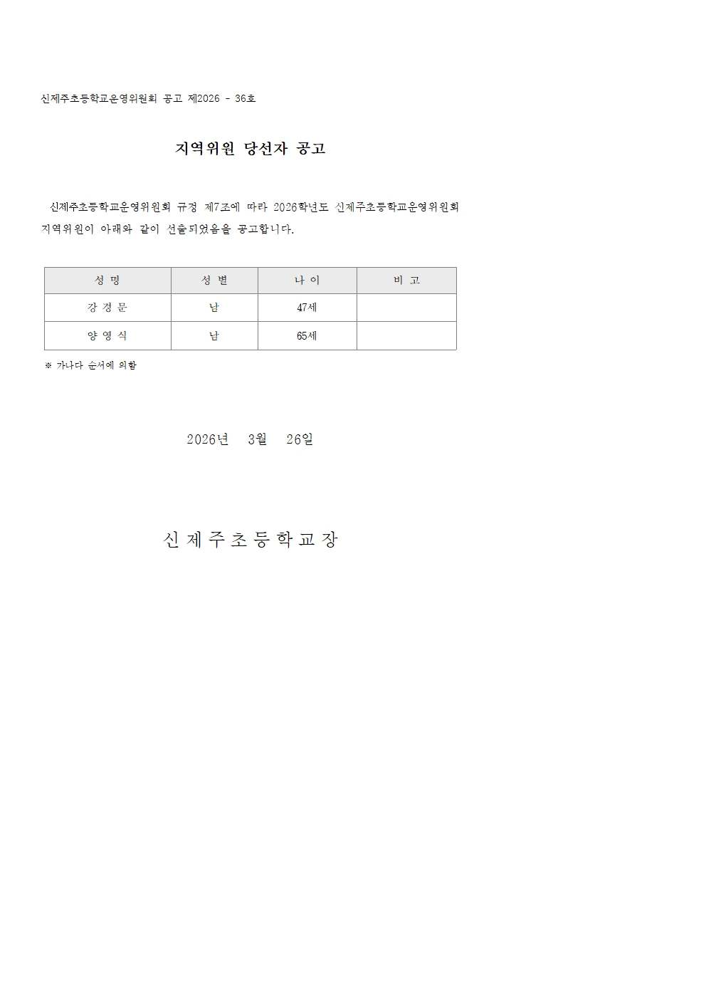 2026학년도 학교운영위원회 지역위원 당선자 공고
