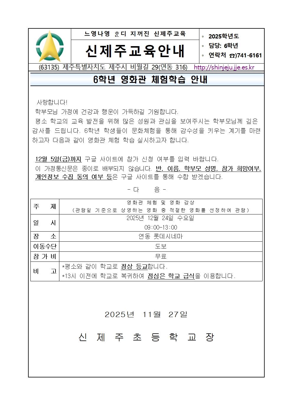 2025학년도 6학년 12월 영화관 체험학습 안내