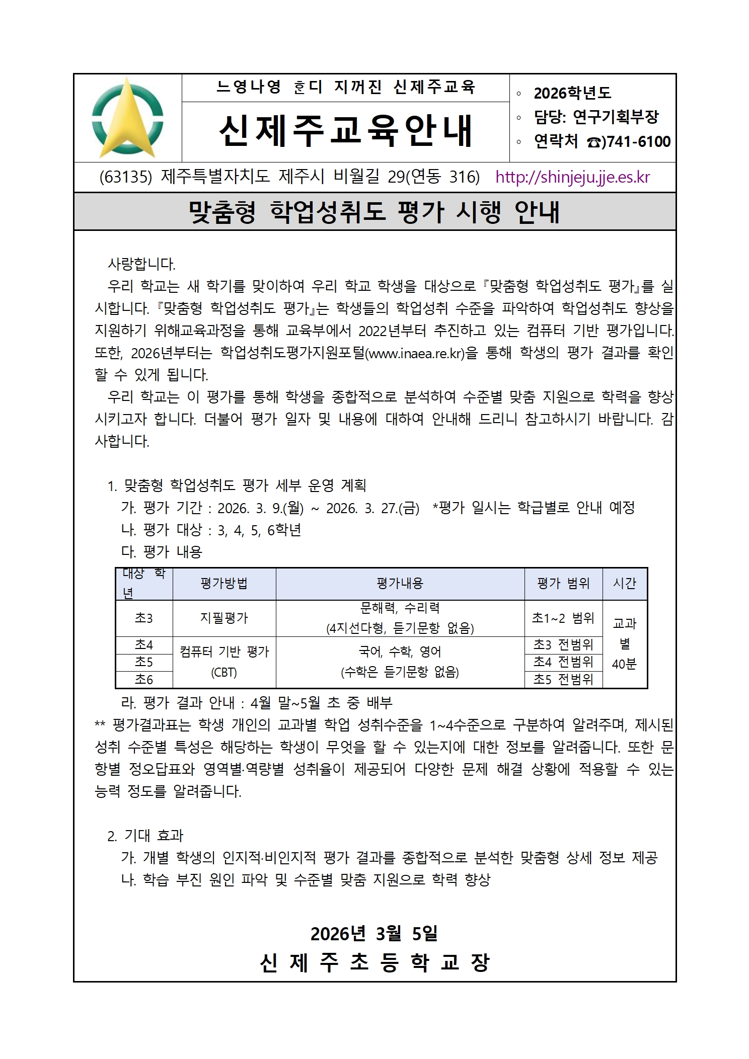 2026학년도 맞춤형 학업성취도 평가 시행 안내