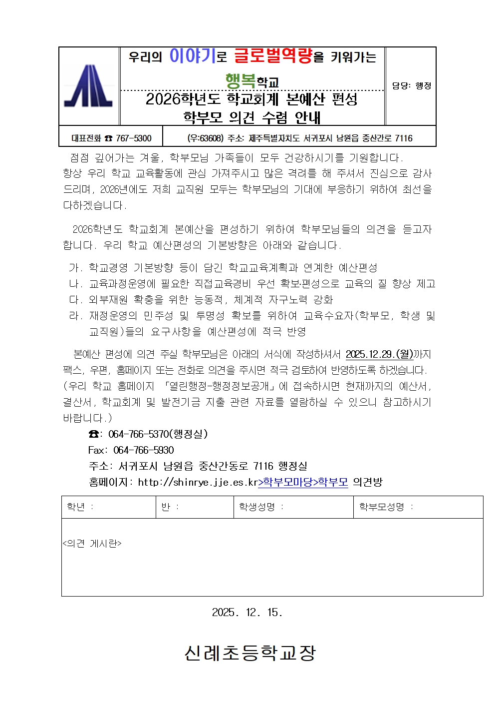 2026학년도 학교회계 본예산 편성 학부모 의견 수렴안내