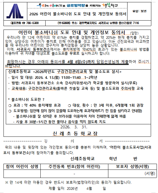 2026 어린이 불소바니쉬 도포 안내 및 개인정보 동의서 안내(1, 2학년)