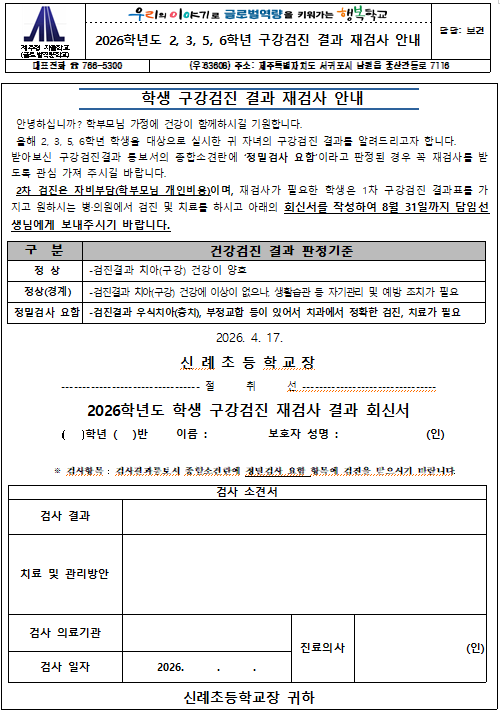 2026학년도 2, 3, 5, 6학년 구강검진 결과 재검사 안내