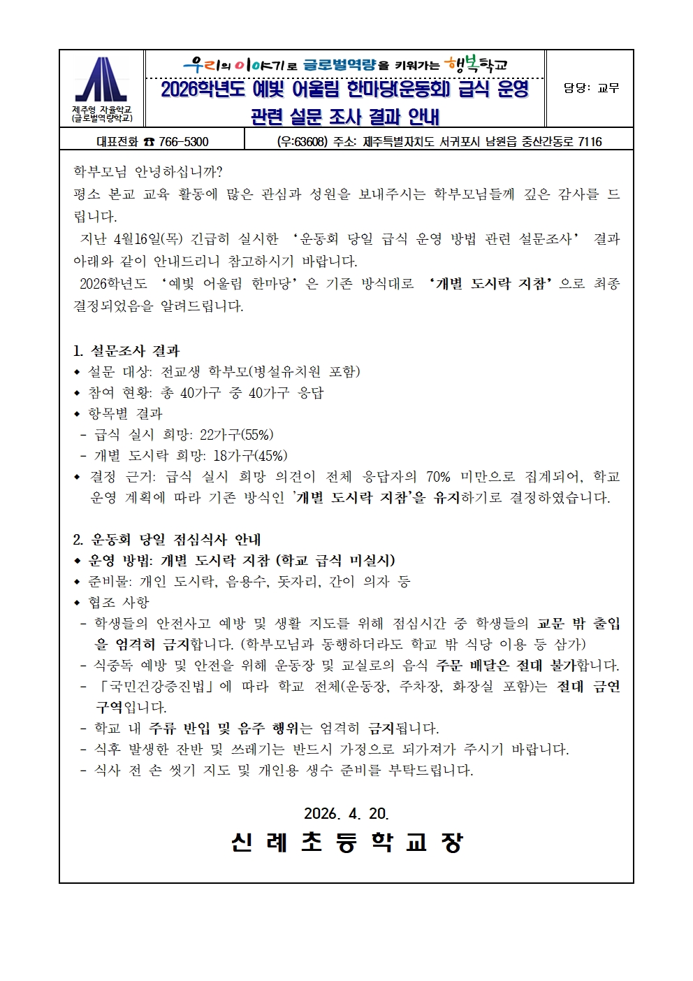 2026학년도 예빛 어울림 한마당(운동회) 급식 운영 관련 설문 조사 결과 안내