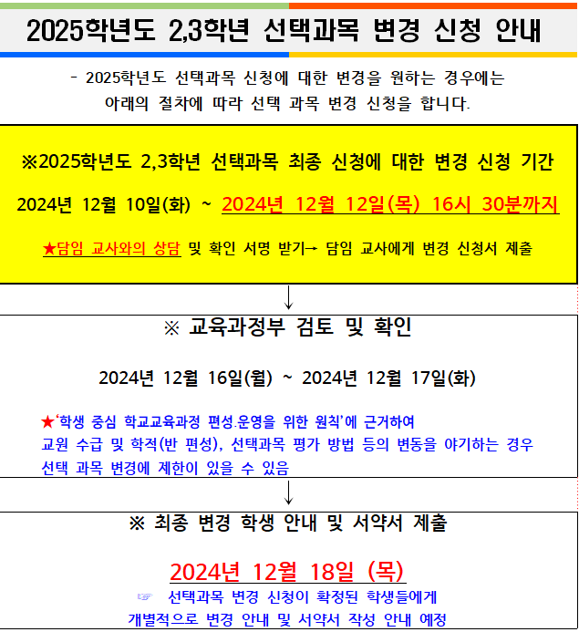 현재 고1,2학년 학생들의 2025학년도 2,3학년 학생선택과목 변경 신청 날짜가 변경되어 아래와 같이 알려드립니다.