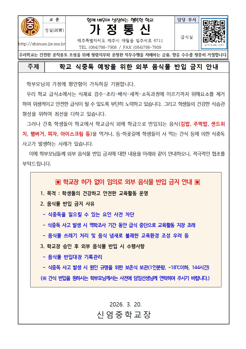 학교 식중독 예방을 위한 외부 음식물 반입 금지 안내