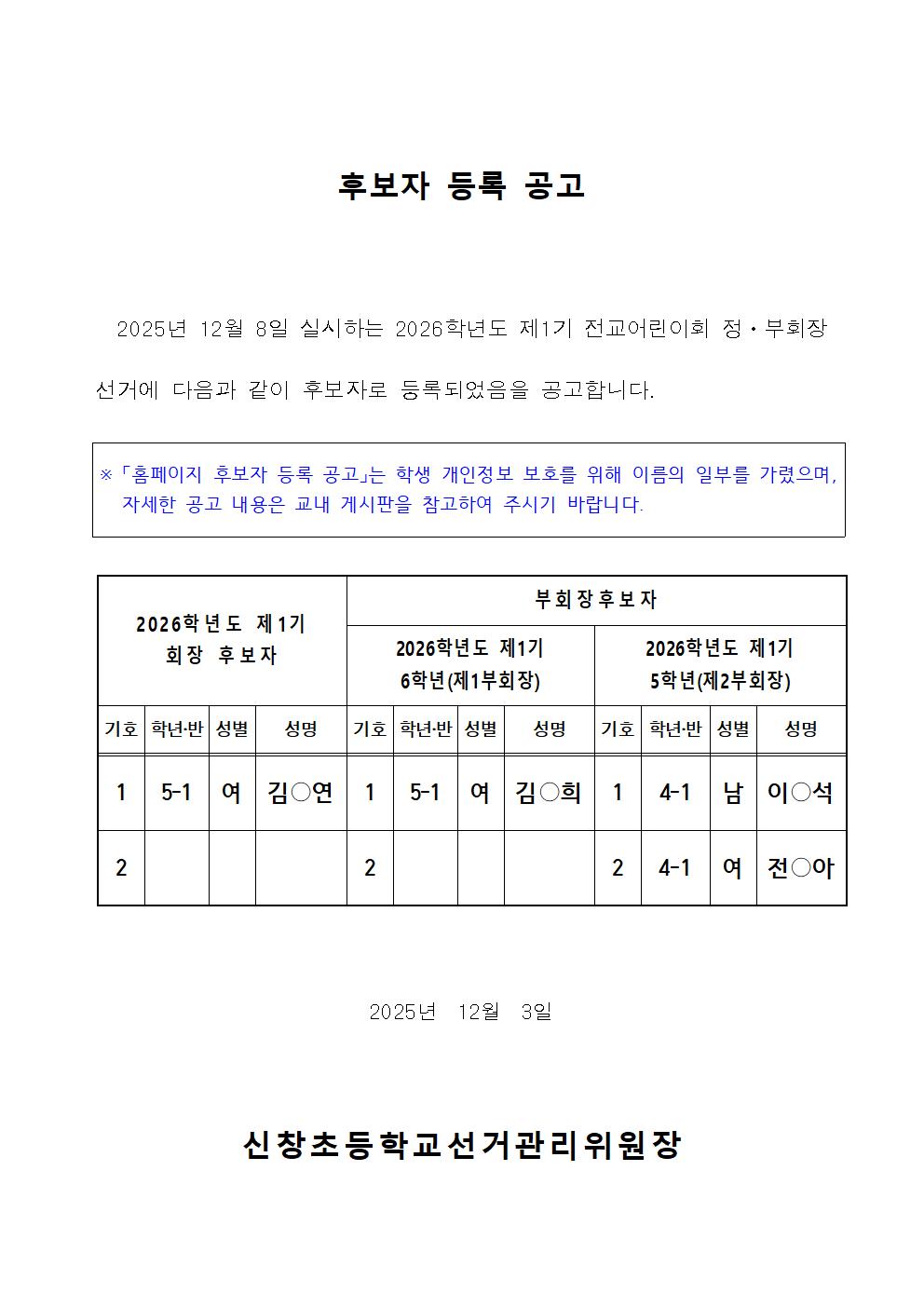 2026학년도 제1기 전교어린이회 정ㆍ부회장 후보자 등록 공고