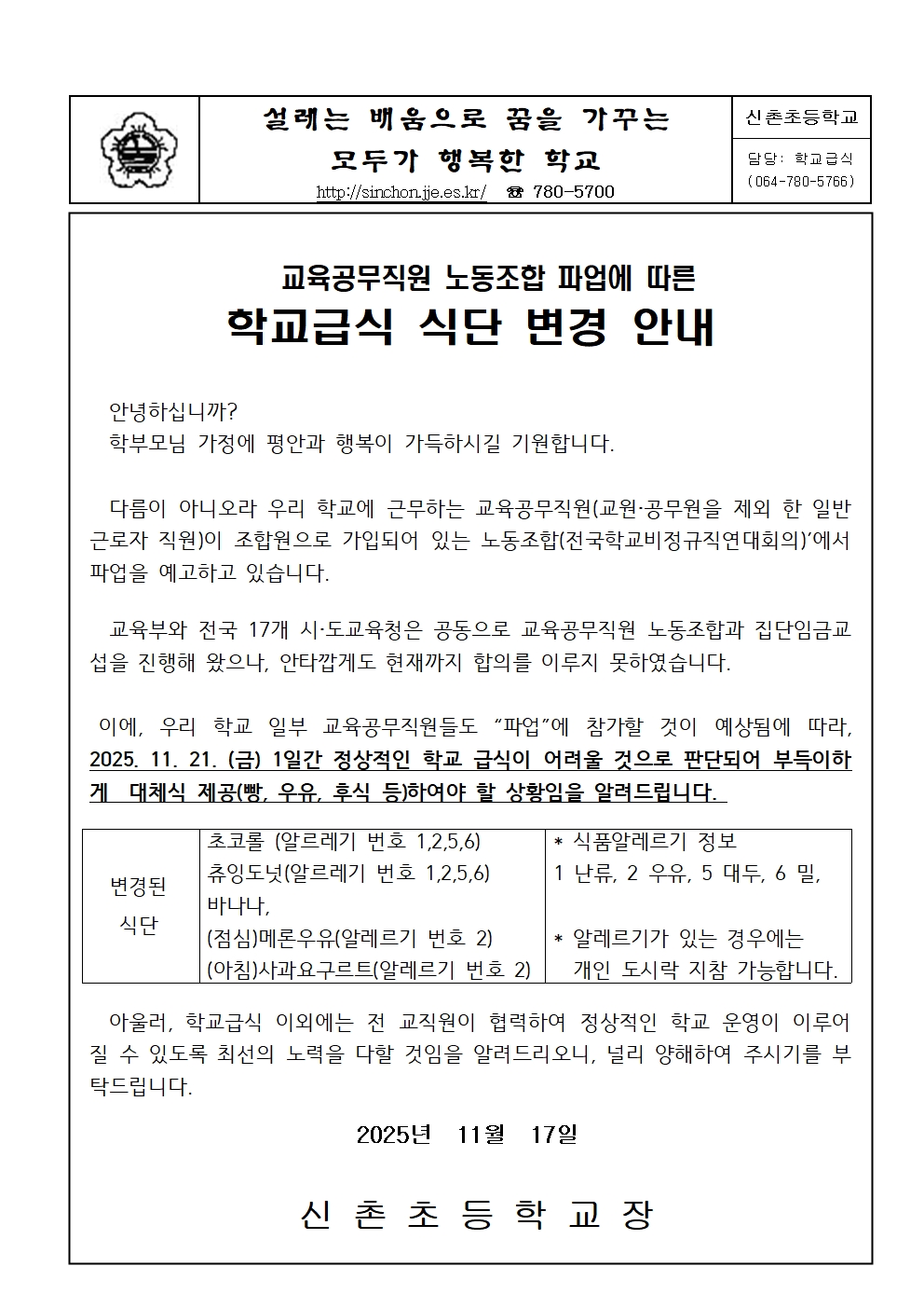 교육공무직원 노동조합 파업에 따른 학교급식 식단 변경 안내