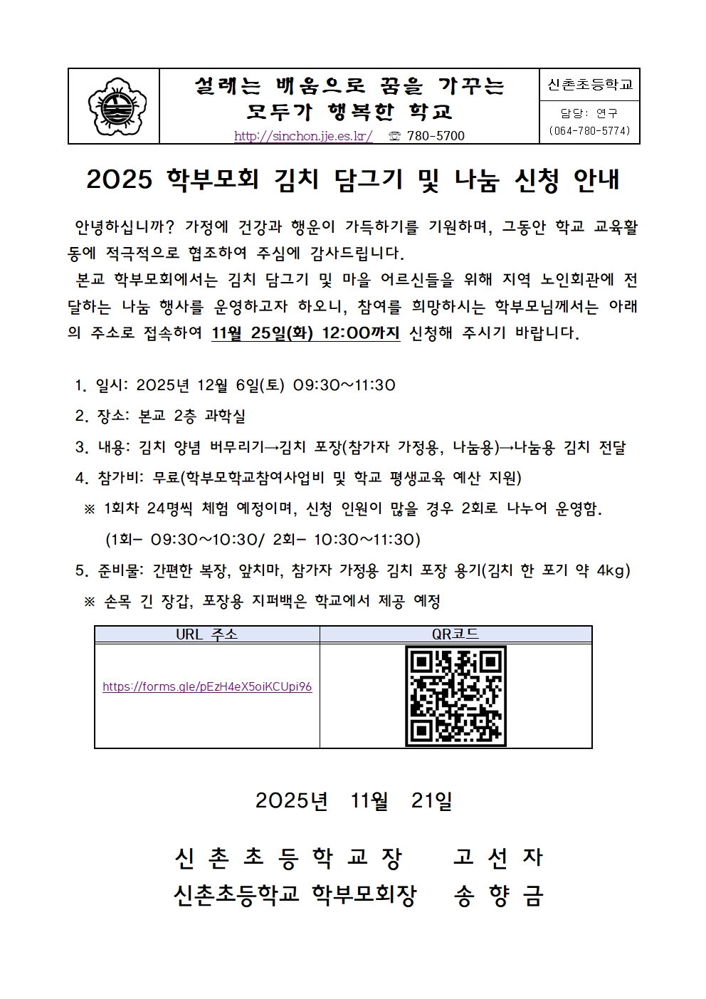 2025 학부모회 김치 담그기 및 나눔 신청 안내