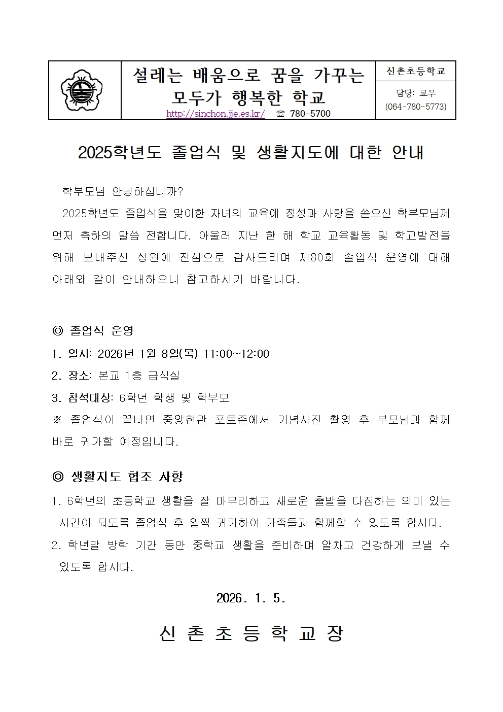 2025학년도 졸업식 및 생활지도에 대한 안내