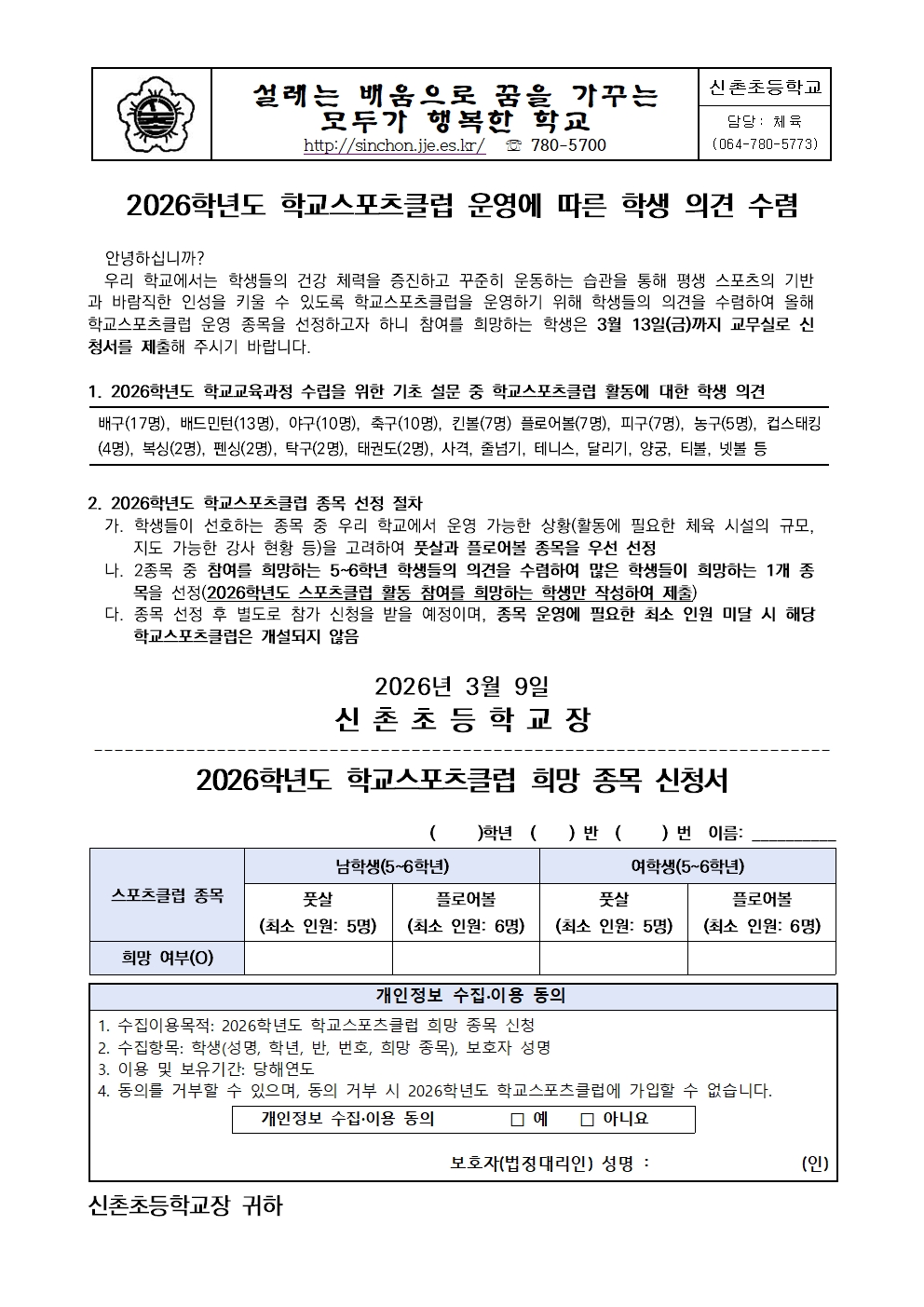 2026학년도 학교스포츠클럽 운영에 따른 학생 의견 수렴