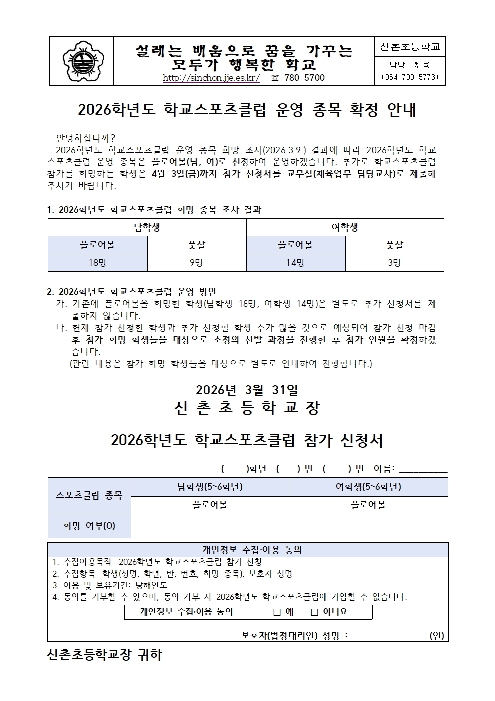 2026학년도 학교스포츠클럽 운영 종목 확정 안내