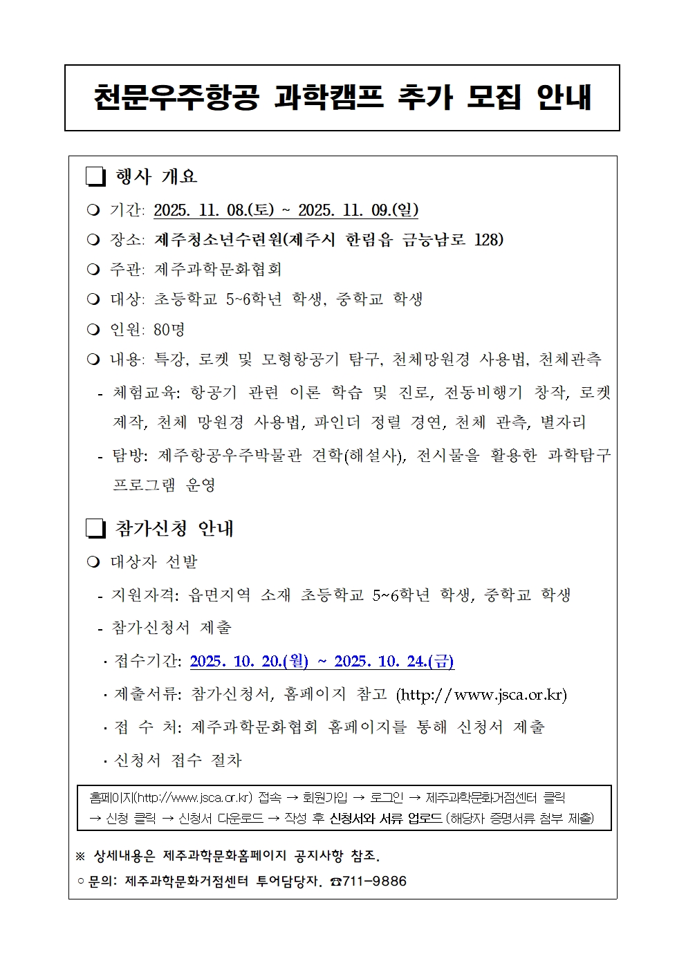 천문우주항공 과학캠프 참가학생 추가모집 안내