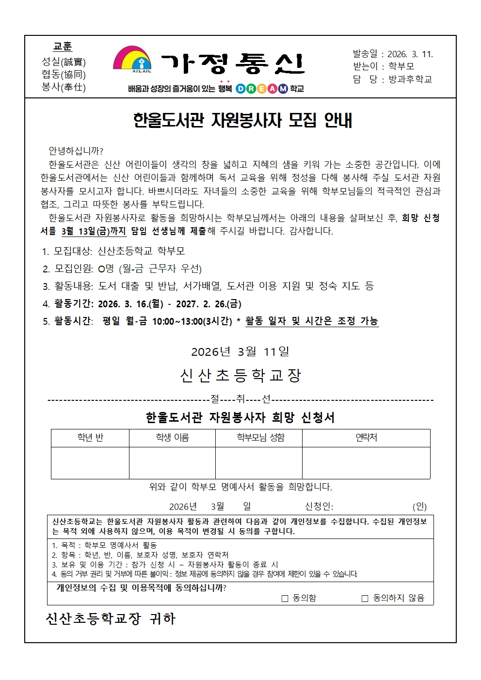 한울도서관 자원봉사자 모집 안내