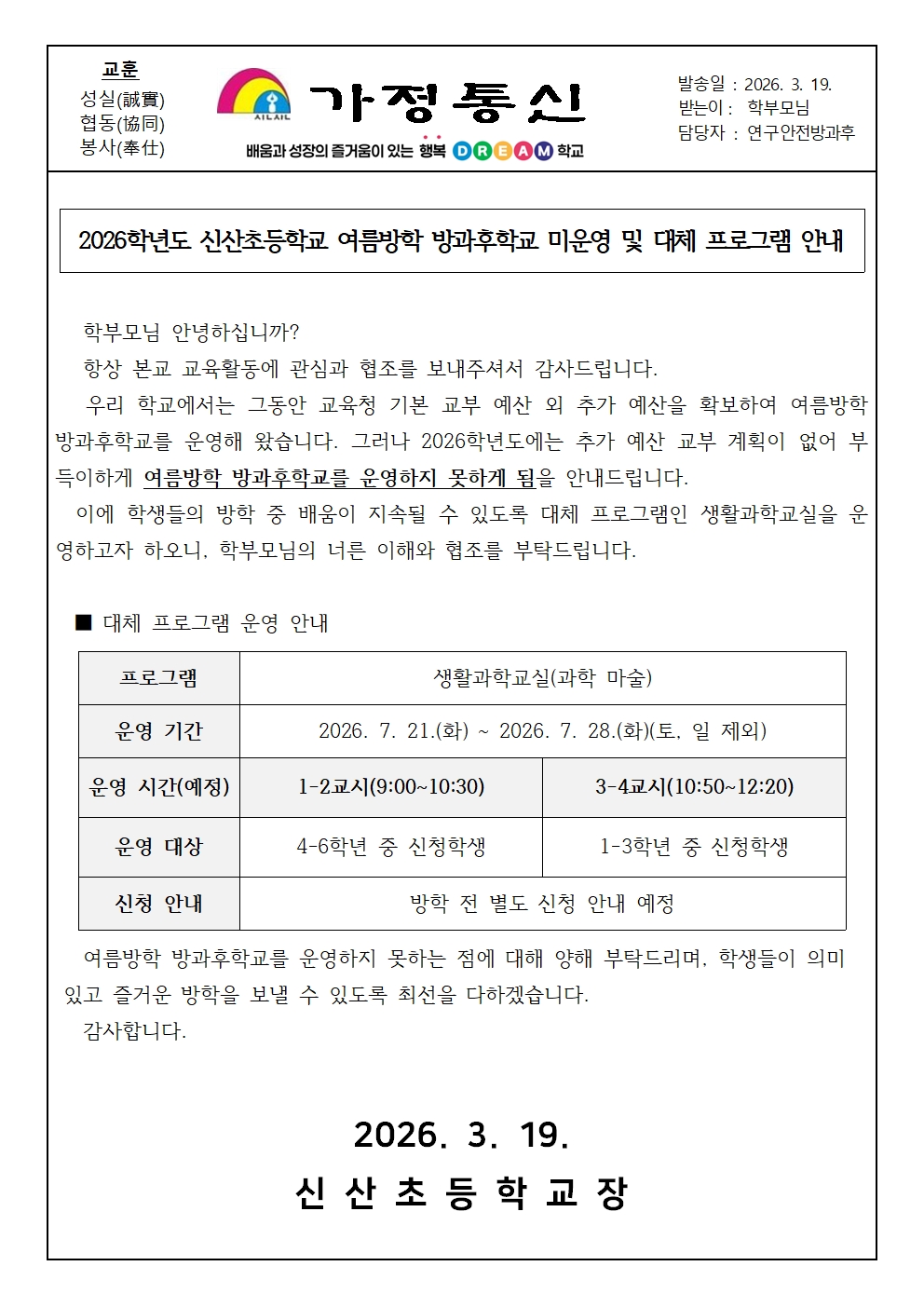 2026학년도 신산초등학교 여름방학 방과후학교 미운영 및 대체 프로그램 안내
