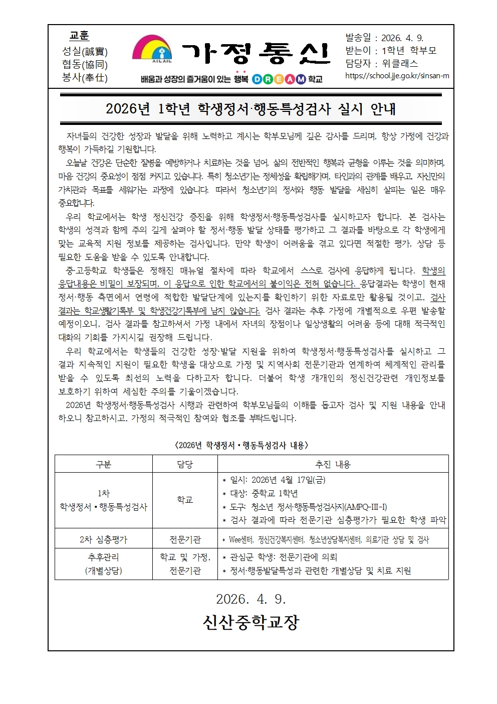 2026년 1학년 학생정서.행동특성검사 실시 안내