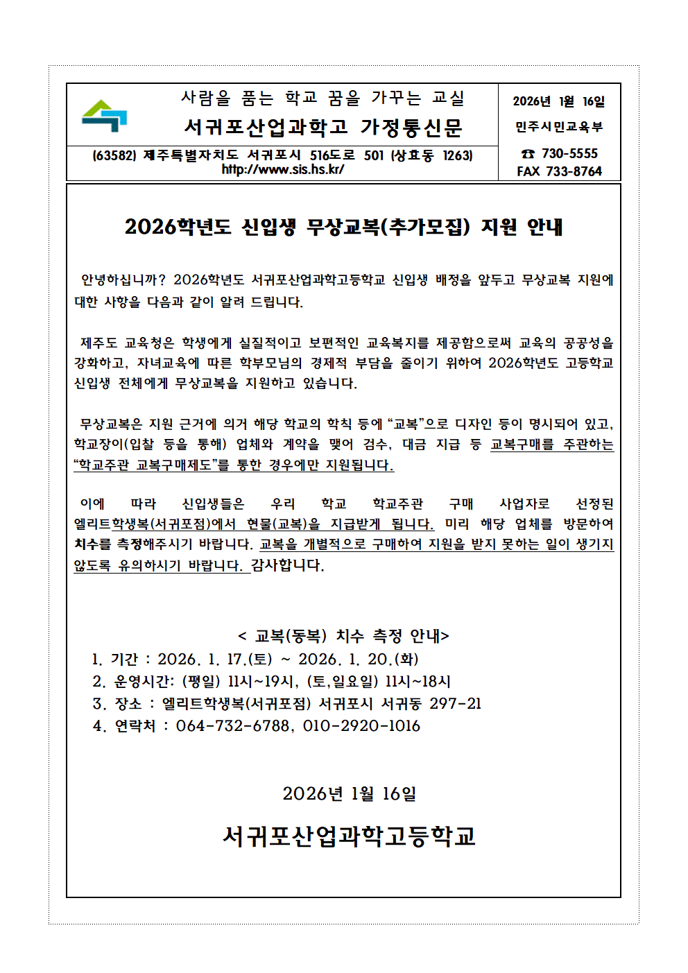 2026학년도 신입생 무상교복 지원 안내(추가모집)