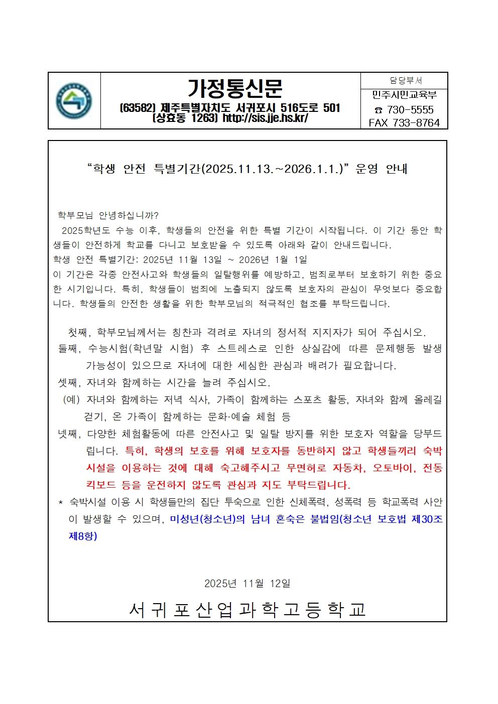 “학생 안전 특별기간(2025.11.13.~2026.1.1.)” 운영 안내