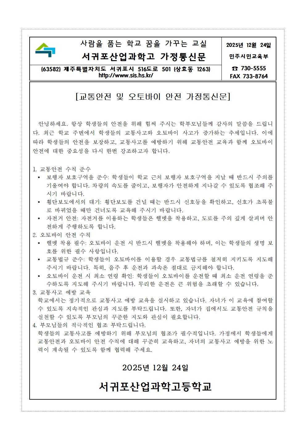 교통안전 및 오토바이 안전 가정통신문