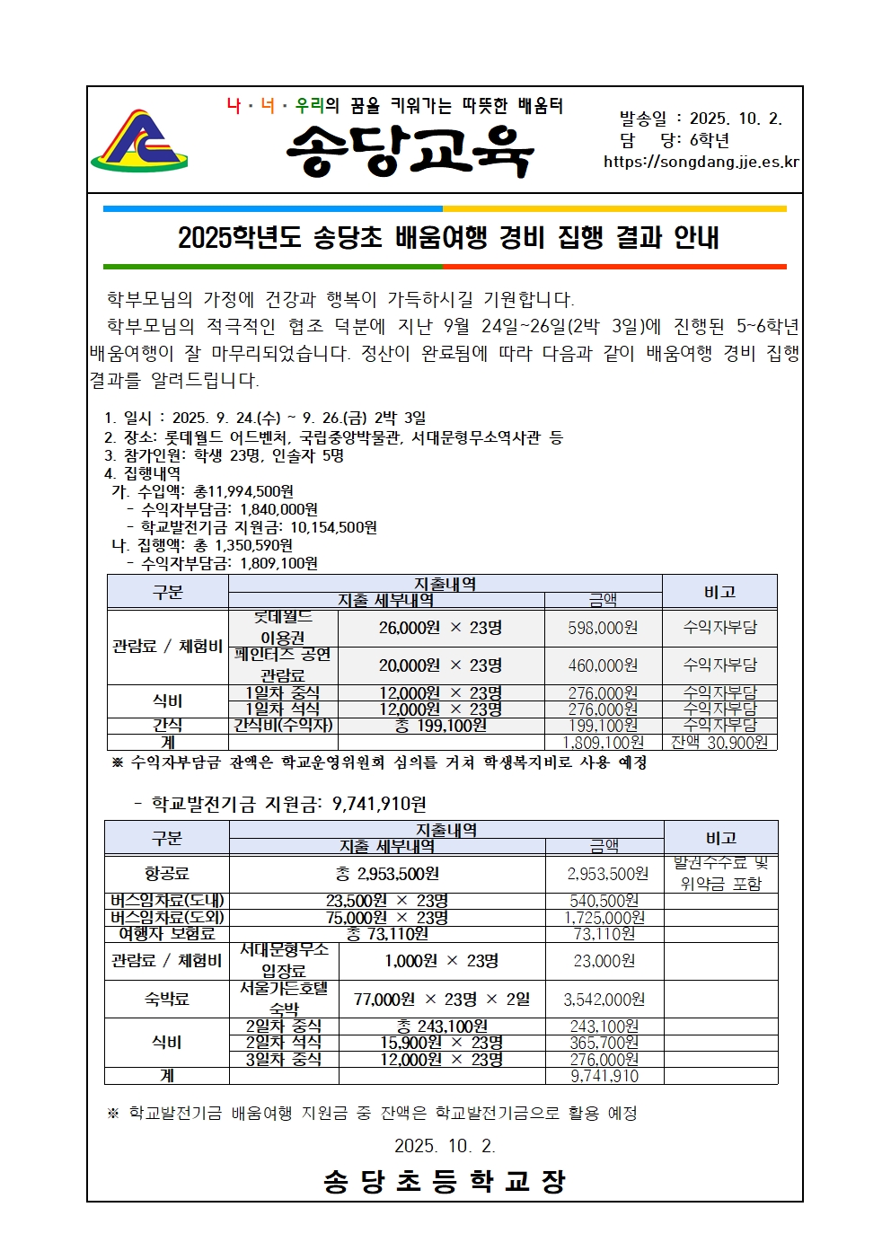 2025학년도 송당초 배움여행 경비 집행 결과 안내