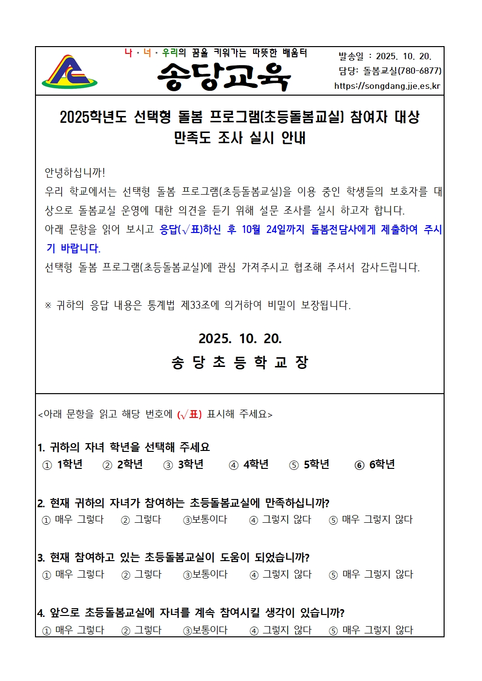 2025학년도 선택형 돌봄 프로그램(초등돌봄교실) 참여자 대상 만족도 조사 실시 안내