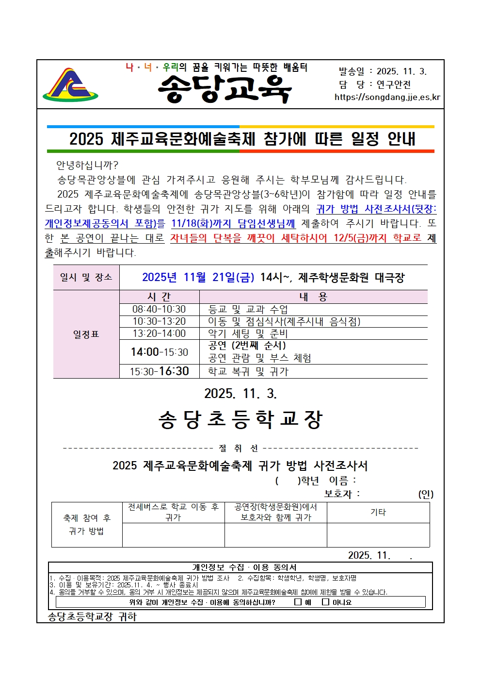 2025학년 제주교육문화예술축제 참가(3-6학년)에 따른 일정 안내