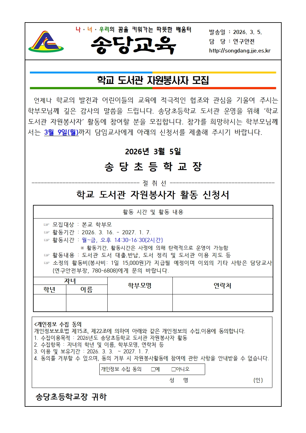 학교 도서관 자원봉사자 모집
