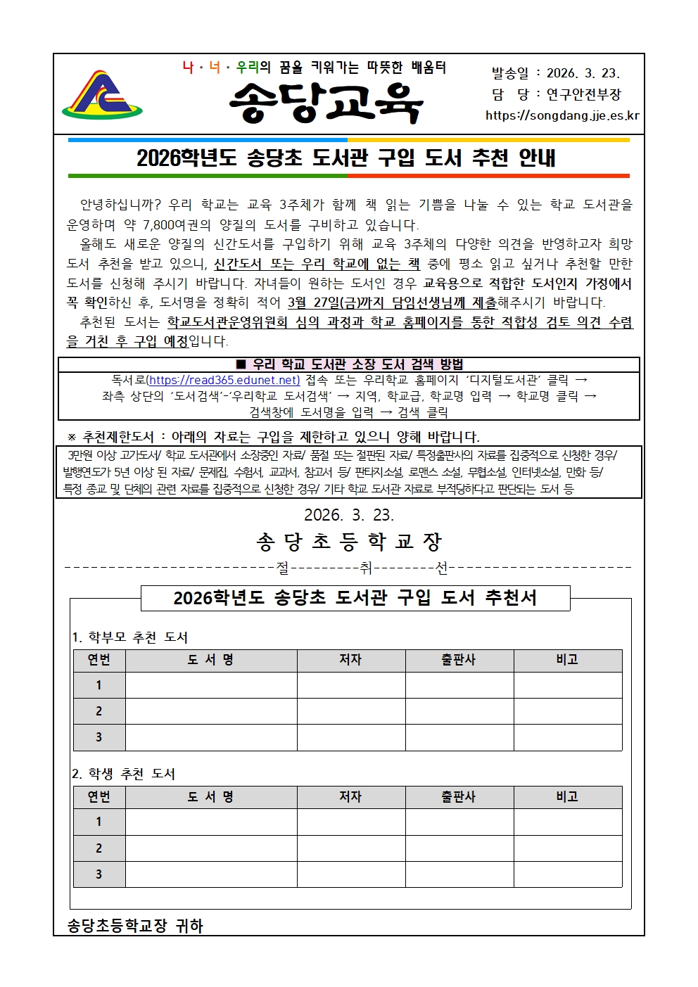2026학년도 송당초 도서관 구입 도서 추천 안내