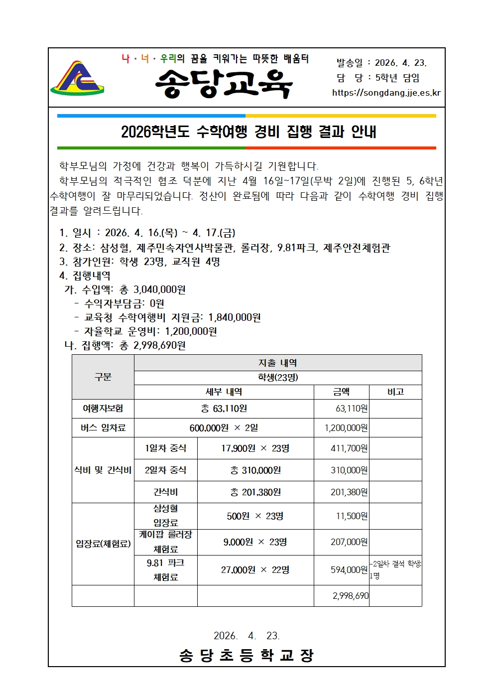2026학년도 수학여행 경비 집행 결과 안내
