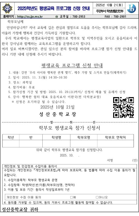 학부모 및 지역주민 평생교육 프로그램 신청 안내