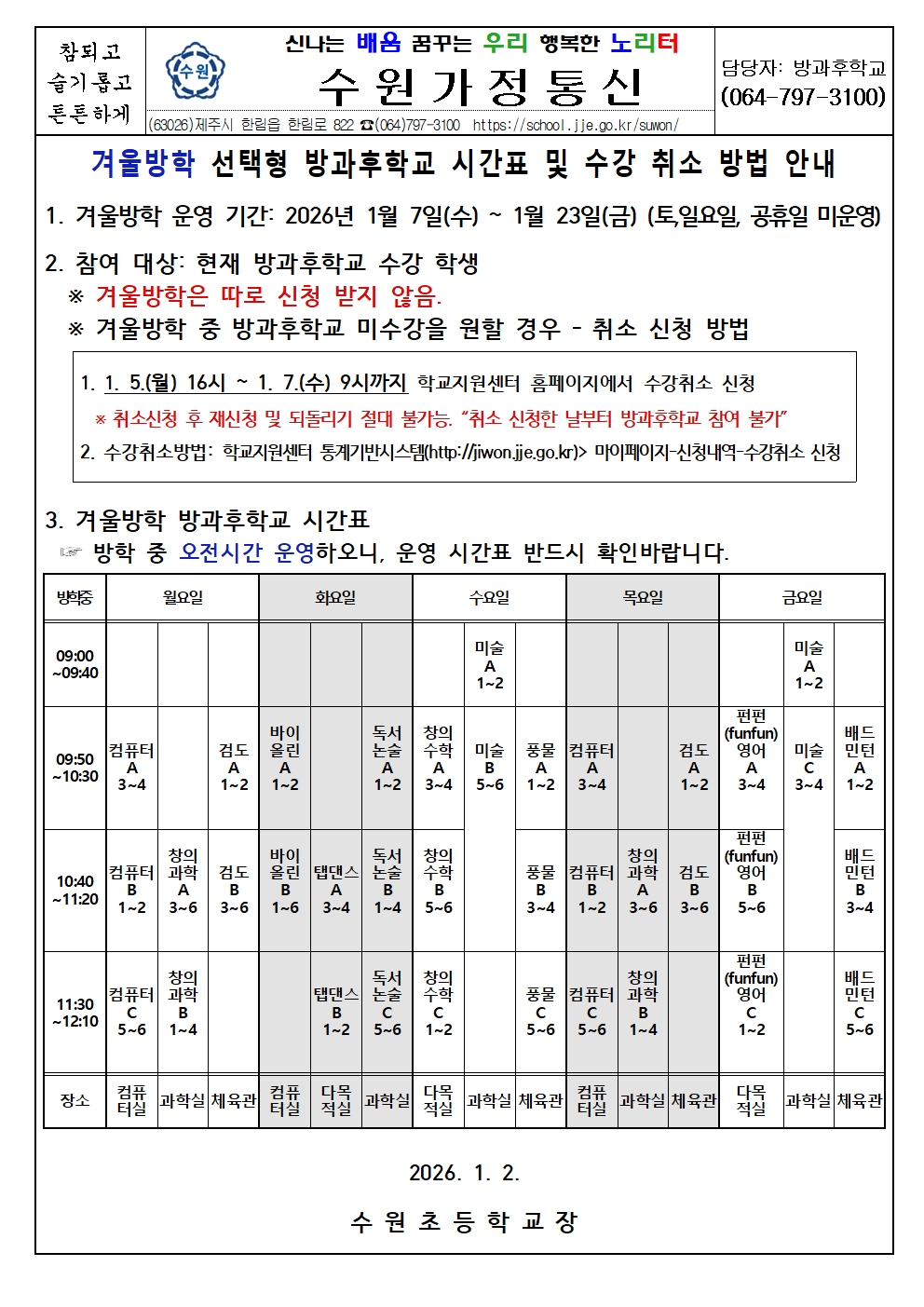 겨울방학 선택형 방과후학교 시간표 및 수강 취소 방법 안내