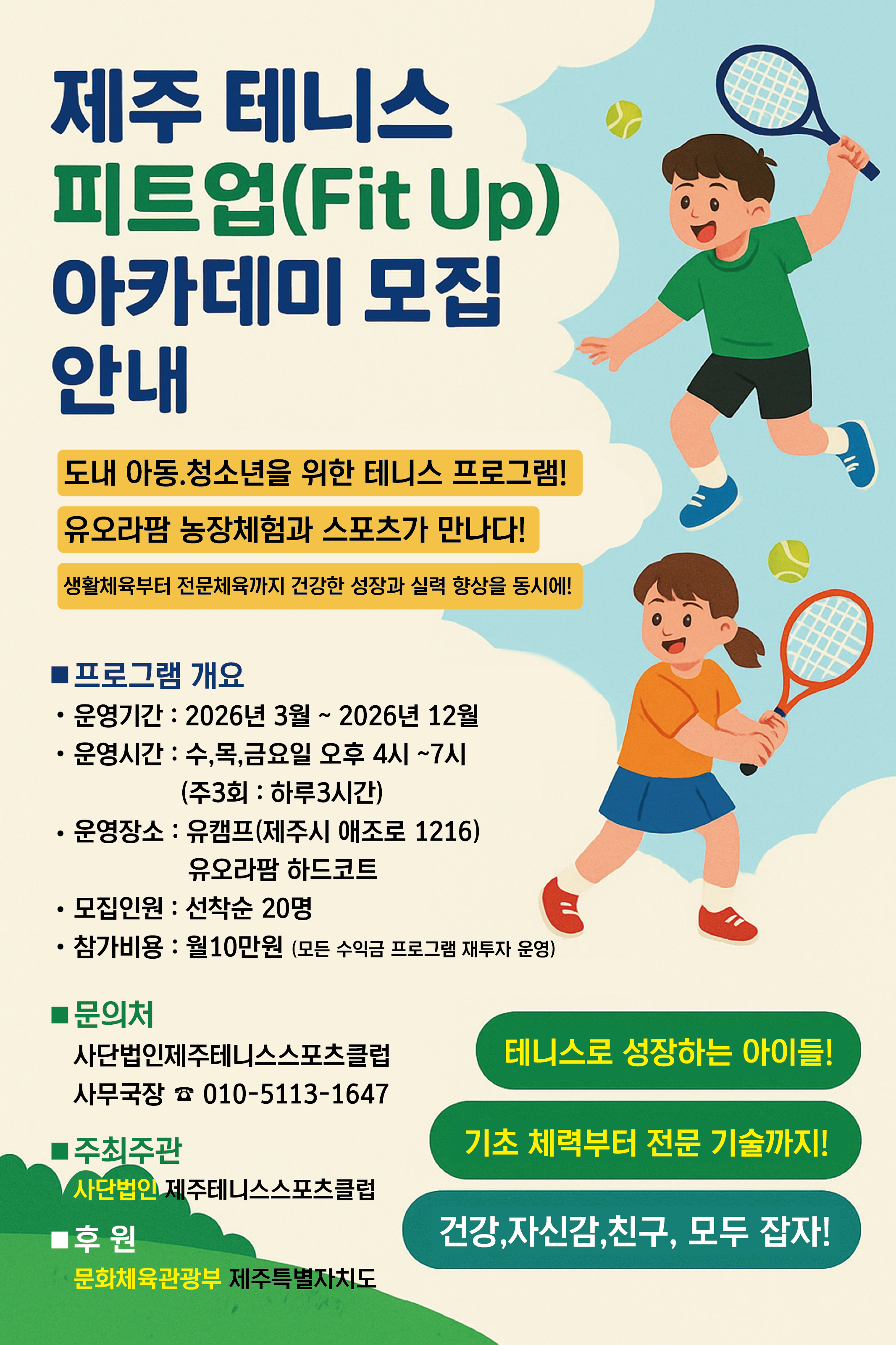 제주특별자치도교육청과 협약하여 운영 중인 제주테니스스포츠클럽에서 생활체육 환경 조성을 목표로 도내 아동 및 청소년을 대상으로 테니스 프로그램을 운영한다고 하오니 참고하시기 바랍니다.