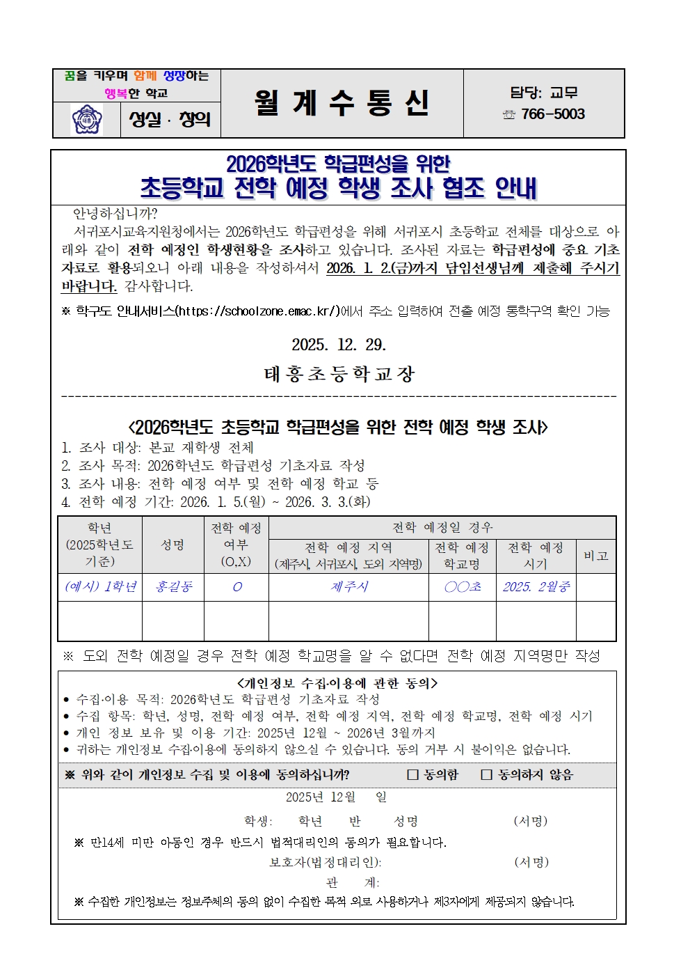 2026학년도 학급편성을 위한 초등학교 전학 예정 학생 조사 협조 안내