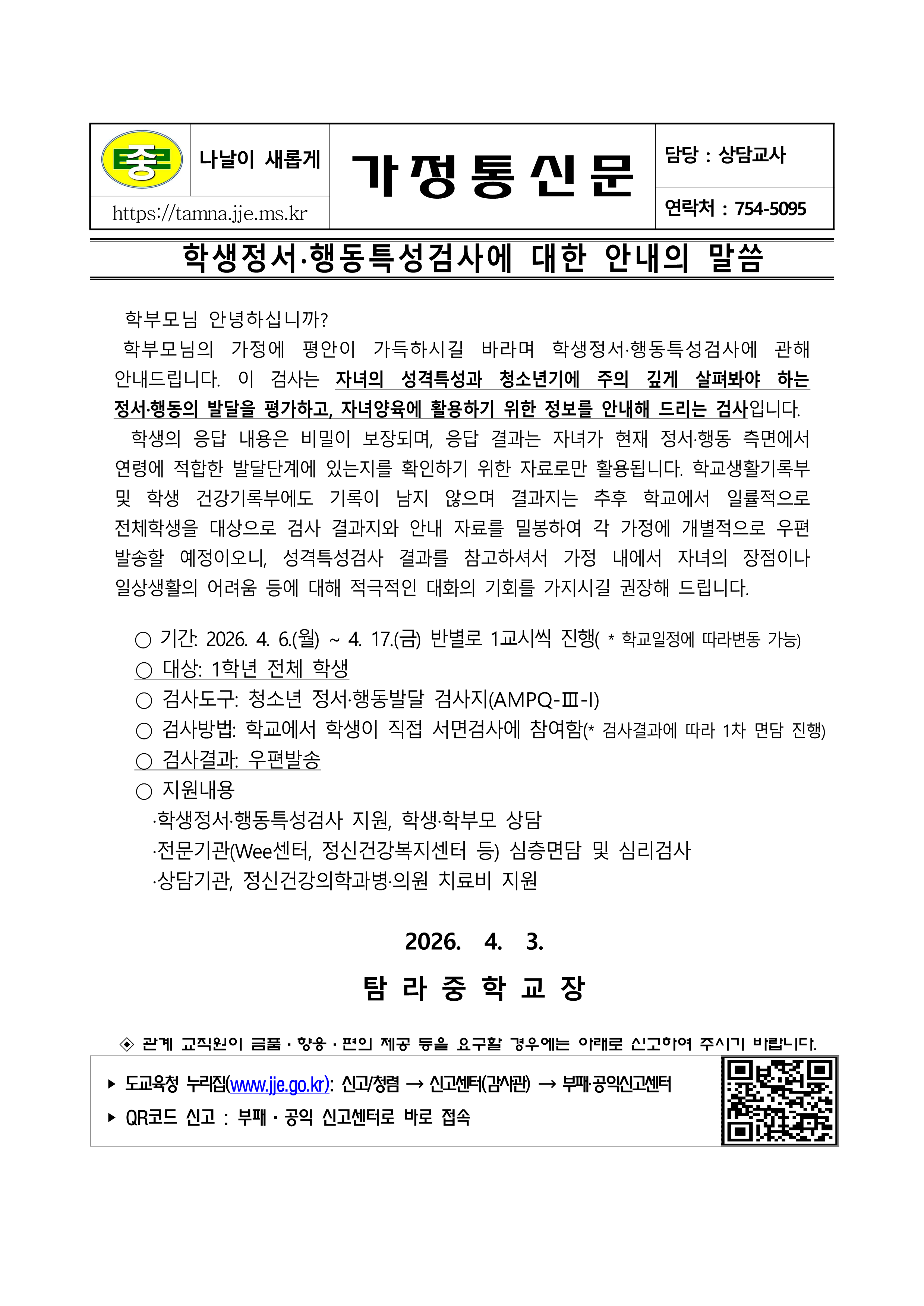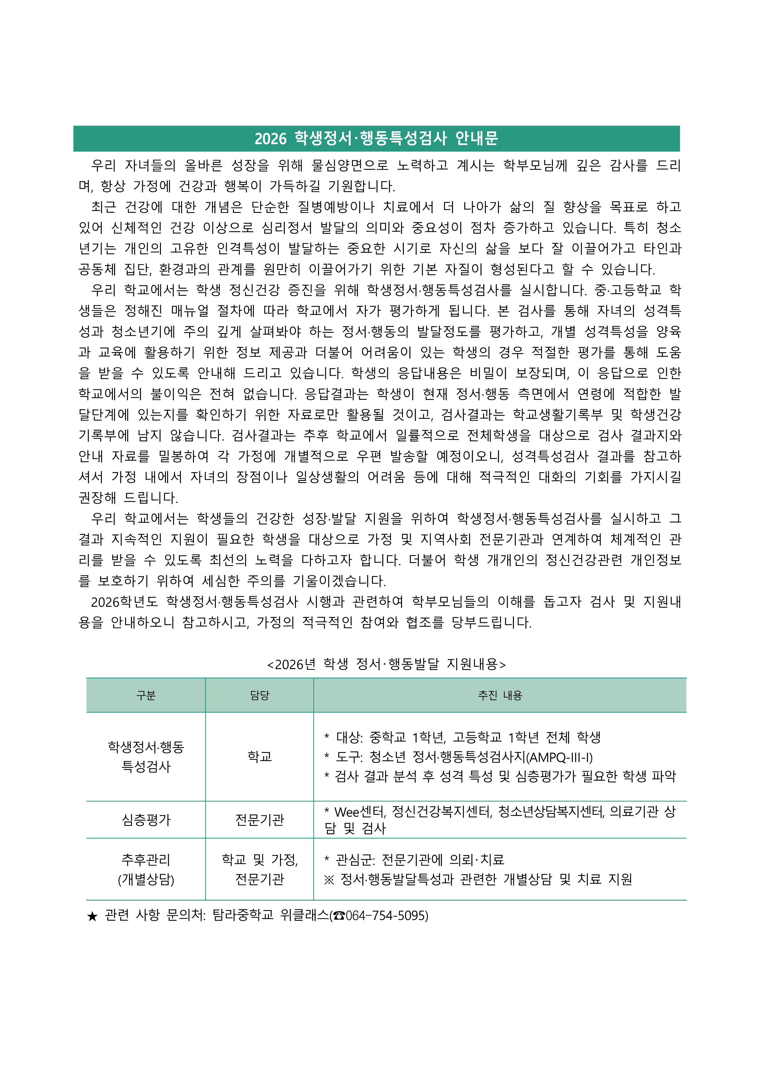 2026학년도 학생정서행동특성검사에 대한 안내(1학년 대상)
