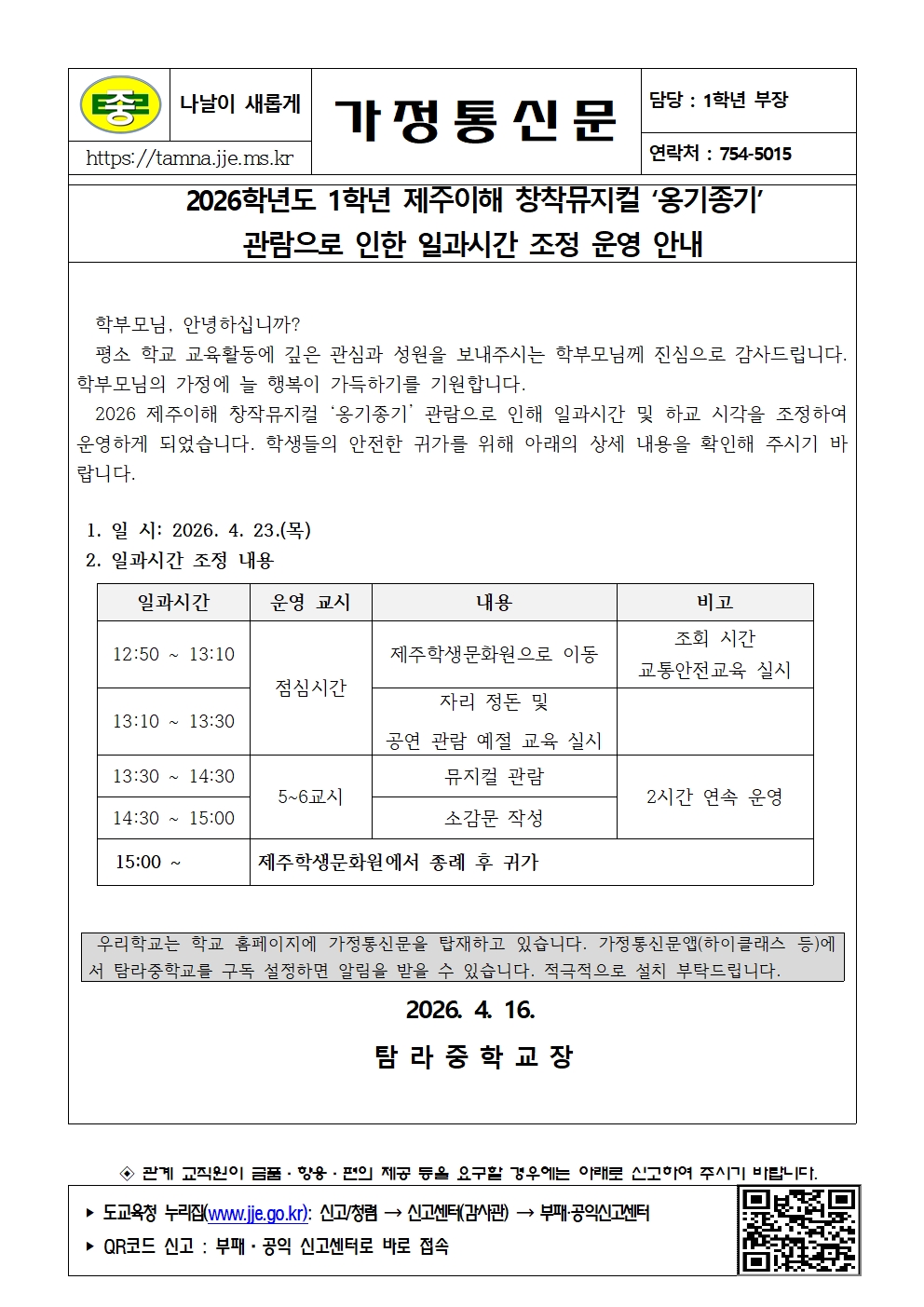 1학년 제주이해 창작뮤지컬 관람으로 인한 일과시간 조정 운영 안내 가정통신문
