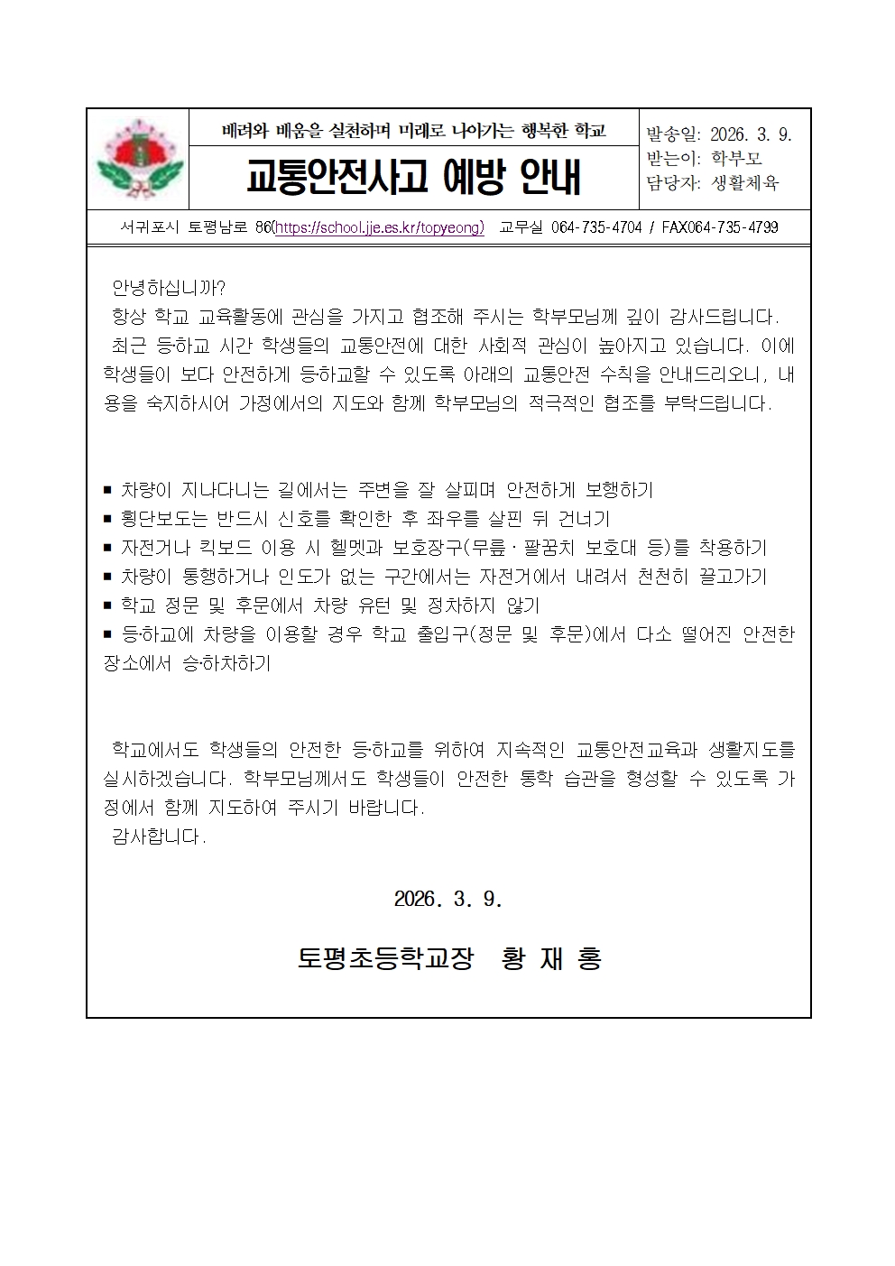 2026학년도 교통안전사고 예방안내 가정통신문.hwp